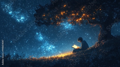 Calm night under the stars, a person reading by a softly glowing lantern