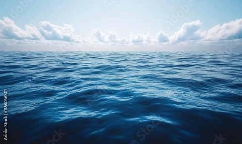 Calm ocean surface under a bright blue sky with fluffy clouds.
