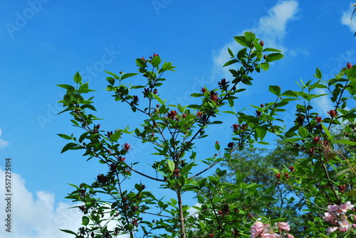 Calycanthus floridus, or commonly known as the eastern sweetshrub, Carolina all spice, or spice bush. Branches, leaves and flowers against the blue sky.