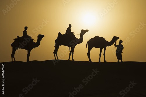 Camels at sunset in the Thar desert, Rajasthan, India