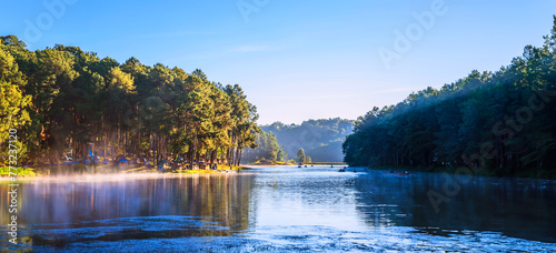 camping and travel Beatiful nature panorama view of Pang Ung lake in the mist at sunrise.