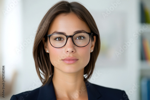 Canadian businesswoman wearing suit and glasses serious work at office