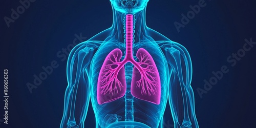 Cancer awareness. Visual representation of human lungs in a vibrant, anatomical illustration on a dark background.