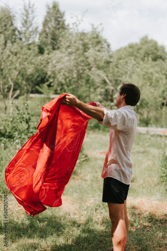 candid young mature choring man chore homework and hanging the laundry to dry on a clothesline on the street in courtyard of village household cottage house. summer, freshness and laundry day
