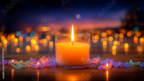 Candle glowing softly in a glass holder surrounded by colorful flower petals, creating a warm ambiance with blurred lights in the background, perfect for relaxation and celebration