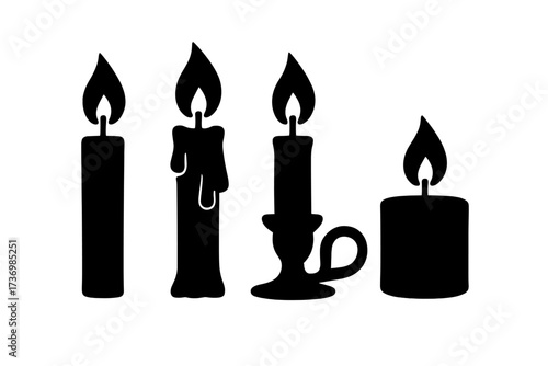 Candle silhouette vector icon set. Collection of burning candles with flames. Graphic elements for celebration, memorial, romantic, vigil, or spiritual candlelight decoration.