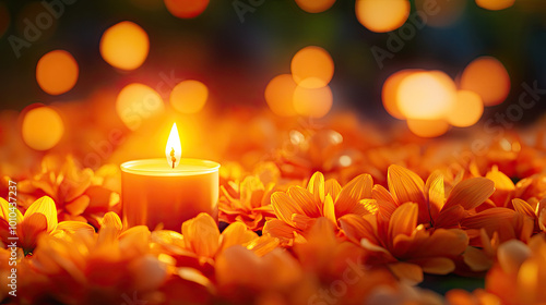 Candle surrounded by vibrant orange flowers on a serene background.