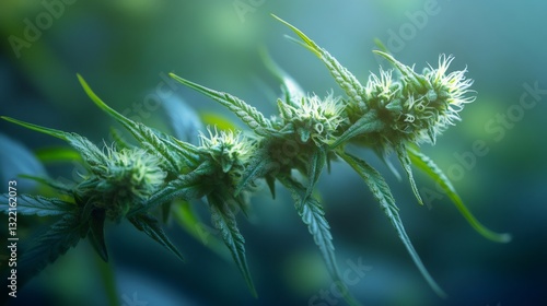 Cannabis plant growing, showing trichomes and pistils with blurred background