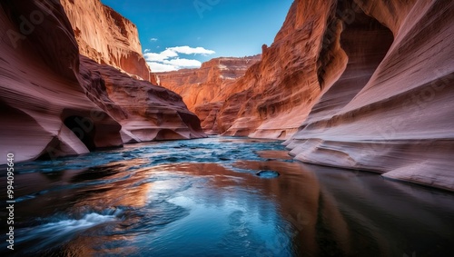 Canyon landscape features river winding through rocks under bright blue sky, perfect for adventure, photography, nature exploration, and relaxation.