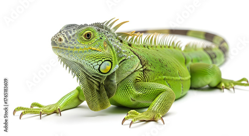 Captivating green iguana showcases intricate scales and vivid yellow accents on a crisp isolated white backdrop, ideal for educational, wildlife, or exotic themes.