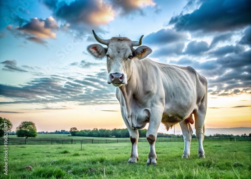 Captivating Low Light Photography of the Largest Cow in a Serene Pasture at Dusk, Showcasing Its Majestic Size and Gentle Nature Under the Soft Glow of Twilight