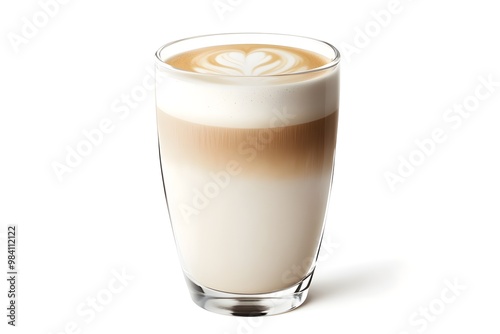 Capture a wide-angle view of a latte with swirling foam in a transparent glass, isolated on a pristine white background in hyper-realistic CG 3D