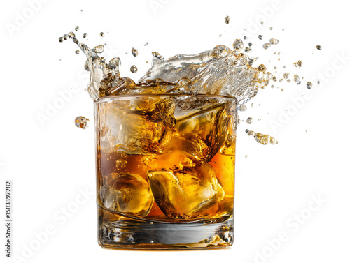 Capturing the dynamic moment of ice colliding with liquid, a refreshing drink explodes in a burst of movement and refreshment.