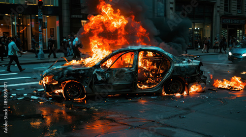 Car burning on city street