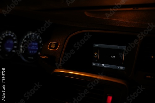Car interior, control panel of audio player and other devices close-up, automobile dashboard of car driving at night