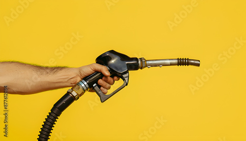 Car refueling gun on yellow background. Gas station with diesel and gasoline fuel