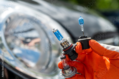 Car service men hold a halogen lamp for repairing or changing a headlight.