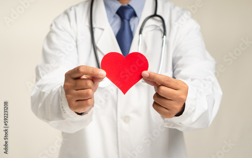 Cardiology and cardiovascular. A cardiologist holding a red heart shape symbol mockup while standing in the hospital
