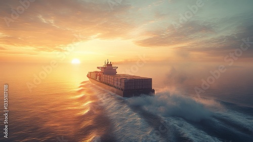 Cargo ship sailing across the ocean at sunset leaving a water trail on the ocean surface