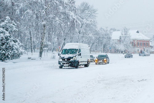 Cars driving on a slippery snowy road on a city street during a heavy snowfall in the evening in winter. Traffic disruption due to blizzards and blizzards. Weather forecast