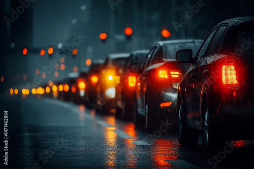 Cars waiting at a traffic light during a rainy evening in an urban area with red lights illuminating the street