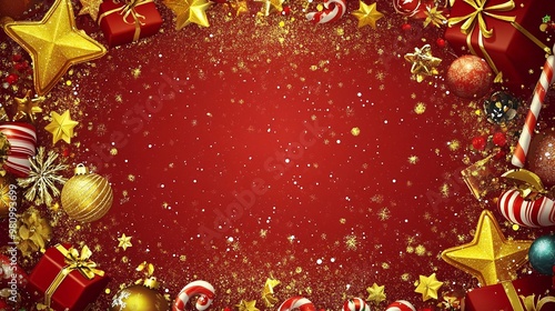 Carta da parati in stile natalizio. Sfondo rosso innevato con ampio spazio vuoto al centro per il testo. Cornice di stelle dorate e ornamenti natalizi