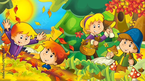 cartoon autumn nature background with girl and boy gathering mushrooms - illustration for children