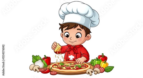 Cartoon boy chef making pizza with ingredients on table. Focused and creative cooking character on white background.
