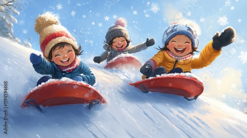 Cartoon children sledding down a hill with big smiles, wearing winter jackets, mittens, and hats.
