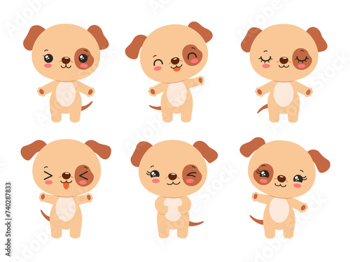 Cartoon cute dog kawaii style emoji icon set. Fun puppy character for kids. Adorable little dog children vector chibi animal. Fun facial expressions - calm, happy, laughing, smiling, waving, winking.