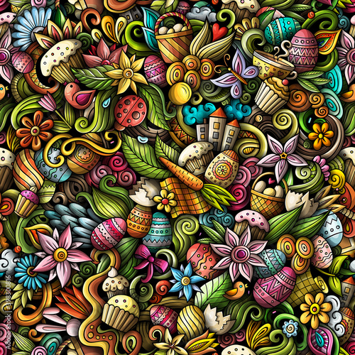 Cartoon cute doodles hand drawn Happy Easter seamless pattern.