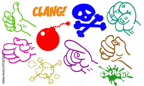 Cartoon explosion with hands and skull in colorful comic book style illustration on transparent background