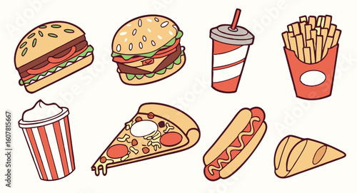 Cartoon Fast Food Icons: Burgers, Pizza, Fries, Soda, Hot Dog, and More; Fun, Bright, and Retro Style