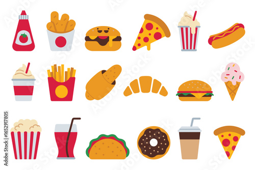 Cartoon fast food icons including pizza burger fries and ice cream vector