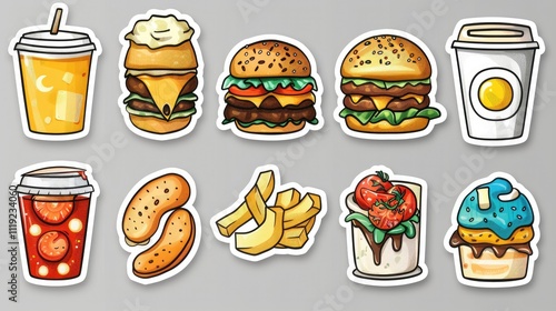 Cartoon fast food stickers burgers, fries, soda, coffee, dessert.
