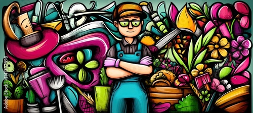 Cartoon gardener with tools, flowers, and potted plants.