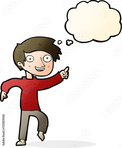 cartoon happy boy pointing with thought bubble