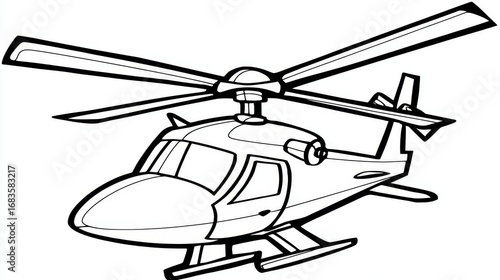 Cartoon helicopter with spinning blades, bold outline minimal flat design, isolated on white background, perfect for children’s coloring book illustration.