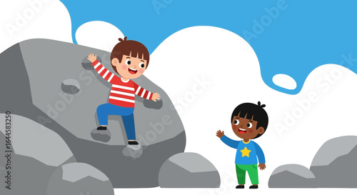 Cartoon illustration featuring a child climbing on rocks with a friend cheering them on happily and smiling outdoors adventure