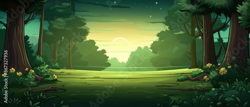 Cartoon illustration of a green forest with trees, grass, and a clearing at sunset. Ideal for backgrounds, book covers, and nature themes