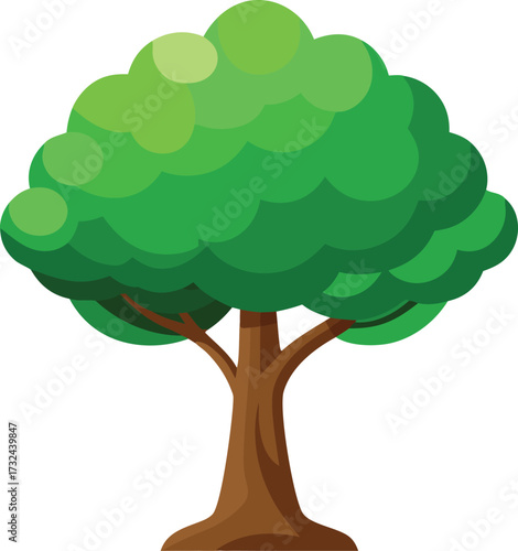 Cartoon illustration of a vibrant green deciduous tree with a brown trunk