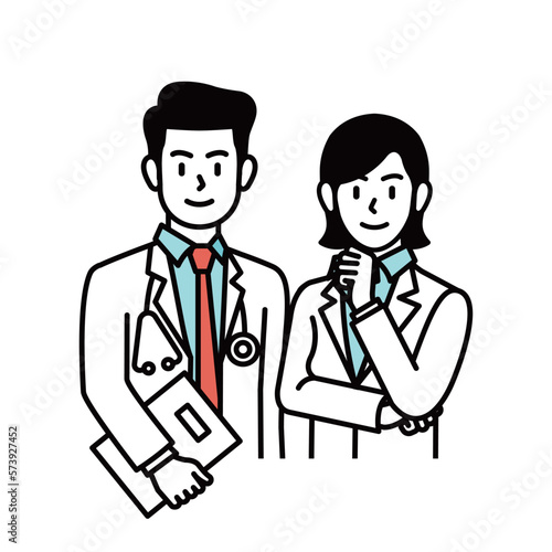 Cartoon illustration of smiling male doctor and female doctor standing together for medicine, health and medical service.