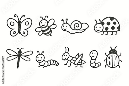 Cartoon insect collection: butterfly, bee, snail, ladybug, dragonfly, caterpillar, grasshopper, beetle