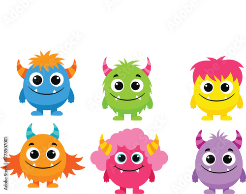 Cartoon monster set, colorful fantasy creatures, cute horned characters, friendly expressions, kids illustration, vector design, isolated playful group