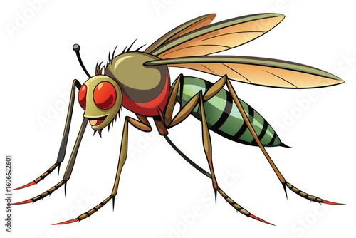 Cartoon Mosquito Insect Standing Sideways with Wings Showing Details and Unique Striped Pattern, Red Eyes, and Spiked Legs