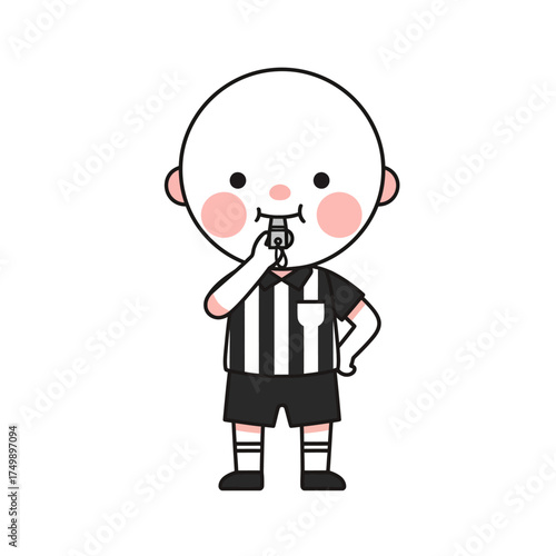 Cartoon Referee Blowing Whistle with Striped Uniform.