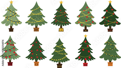 Cartoon set of decorated Christmas trees with stars, lights, and ornaments, festive holiday symbols isolated on white background.