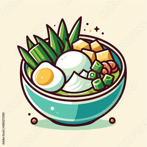 Cartoon Style Illustration of Indonesian Traditional Food Lontong Sayur in a Bowl