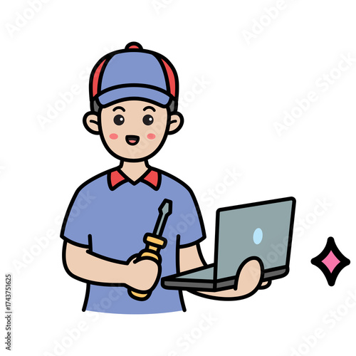 Cartoon Technician with Laptop and Screwdriver on Transparent Background Digital Art