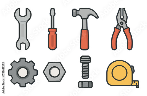 Cartoon tools set with wrench, screwdriver, hammer, pliers, bolt, nut, tape measure